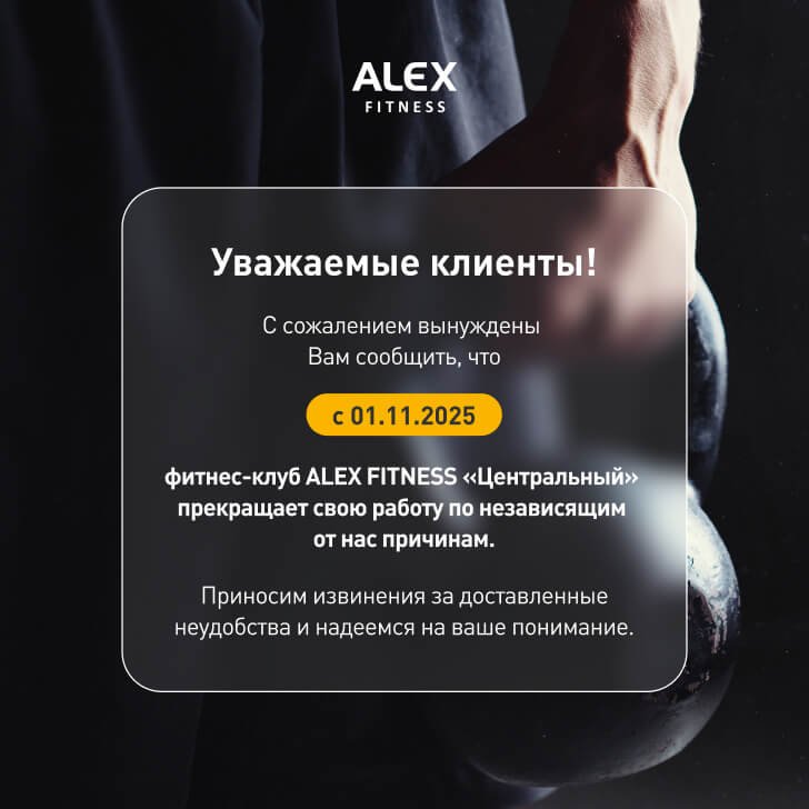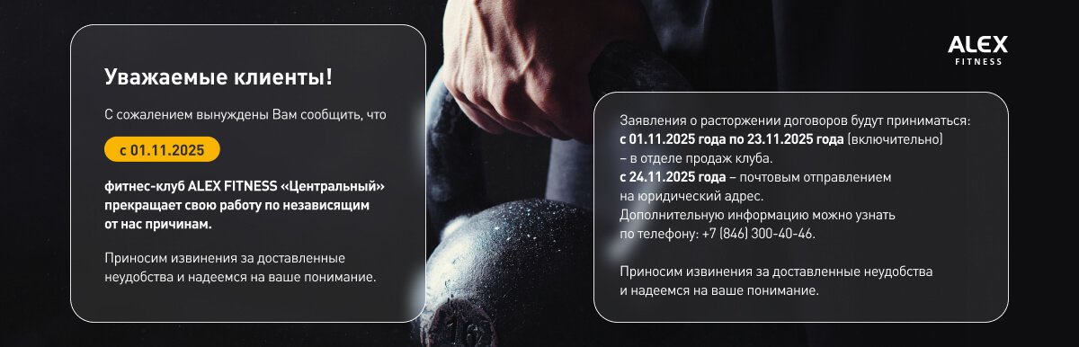 Учитывая закрытие Клуба ALEX FITNESS «Центральный», настоящим разъясняем Вам, что заявления о расторжении договоров (с обязательным указанием в них обратного адреса и полных реквизитов банковского счета) будут приниматься: